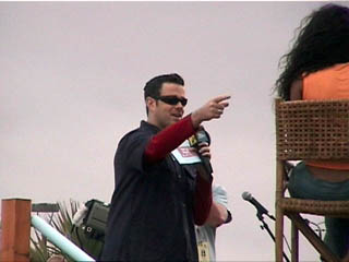 Busta Rhymes in the sand, with some cameras and lights all around him. I guess they were in between takes of some shoot for something or other, cuz he was pimpin' and talking on his cell phone in the sand. Ok, so I guess I would see some famous people around. Actually I ended up seeing a bunch of VJ's, like Ananda and Dave Holmes and that guy Ray who won that who wants to be a VJ contest this year. Who turned out to be a massive chain smoker. I mean... between shots, he would have to smoke. And even between takes... while the camera man was setting up for the next take, he had to sneak a drag off his cigarette, then he'd hide it on the floor or hold it off camera while he was talking into the mic hahahaha.