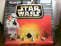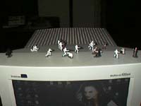f yesterday's update sounded depressing or anything like tha to you, please don't worry, I wasn't depressed at all, just not in a mood to write in this thing. I'm saying this because Ben from Berkeley wrote to me and he was trying to encourage me or make me feel better or something. I appreciate it a lot, really. I know that people are out there reading this, I'm just jealous of Cami's popularity, that's all :) So anyway, earlier today, Cami and I went to Toys-R-Us to buy a birthday present for her brother Kirk. Well it ended up that she didn't buy Kirk anything, and I ended up buying a bunch of stuff. I knew this was gonna happen!! Anyway, they had these old Micro Machines Star Wars action figures from 1997 on sale, for only 97 cents for each pack! So I bought like six packs of them, and I opened up two of them and created a little battle scene on top of my monitor. There's Luke Skywalker, Han Solo, Obi Wan, Yoda, C3PO, R2D2, Princess Leia, and Chewbacca battling it out with Darth Vader and some storm troopers. I also got two packs of ships, including one half-completed Death Star. I can't believe these things were so cheap! By the way, the person you see on the desktop of my computer monitor is my fiancee, Natalie Portman. We're getting married soon... only she doesn't really know it yet.