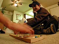Kevin came over for dinner tonight. Cami always refers to him as "Kevin, you know, my friend Kevin". My Friend Kevin. Like that balding midget thing that hangs out with Mephisto on South Park that he calls "My friend Kevin". They played this rock game from Africa that I don't know the name of that Cami and Helen used to play all the time while procrastinating from studying for finals. On the right is a picture of them playing this game. I didn't play because my head was kind of too foggy, but I did take this picture. If you want to see a bigger version of it, you can check out my soon to be gigantic photo archive.