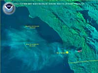 The fire. Still going on. There is this satellite image of what all the smoke looks like from space. There's a lot of smoke. Thing is, the wind is turning the other way now (blowing back on shore, the way it usually goes) so all that smoke is coming back toward us. I think the ash in the air is only aggravating my condition more and yeah. Anyway. I don't want to write a whole update about me bitching about being sick, but it seems like that is what happened. And oh yeah, I put up the first new Hall of Shame of the new millenium on the riceboy page. So check it out and junk.