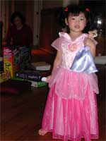 wearing a pink Cinderella costume outfit thingy that she's wanted for a