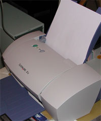 Anyway. I went to target to look for it, and there it was, for $29.87. Amazing. I brought it home and hooked it up and well, it's not the greatest printer in the world, but it is certainly functional, and very, very inexpensive. It isn't exactly the best design either. Like if you have a color cartridge and a black cartidge, you have to manually swap out the cartridges if you want to print in color. Of course, the color cartridge also has black in it, and the color one is the only one this printer comes with.