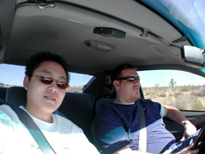 know I usually start new update pages on Sunday, I am currently in Scott's car on the way back from Vegas, and we are stuck in some traffic in the middle of the desert, so I decided to just take a few pics and write this little thing while I was sitting in the car. We tried to stop in Stateline to ride the Desperado roller coaster, but it was closed, so we ended up riding the lame log ride instead. For a log ride, it's pretty lame, but it does have the twist of also being a floating shooting gallery. You get these wireless guns to shoot at targets and keep score. Some of the targets are just little lights to shoot at, but others are mechanical people who you shoot at... and some of them shoot water back at you! That was sort of a surprise.