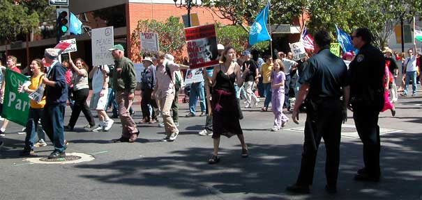 eeing how wonderful the weather was looking this afternoon, I just had to go outside. But to where? What would I do? Well, not knowing exactly what I was looking for or what I was going to do, I drove to downtown San Diego and got some lunch at Horton Plaza. While walking around the Gaslamp quarter, I ran into a big anti-war protest. Maybe it's just me but isn't it just a teeny, tiny bit late for this? And are these people out here just on the general notion that war is bad? Cuz, maybe it was just this particular group, but I had to wonder if any of these people even thought about the meanings and implications of what they were saying.