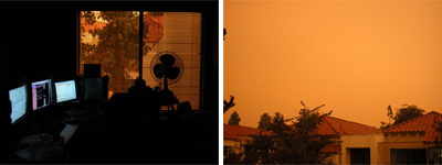 The Fires - I haven't seen a blue sky in three days. During the day time the sky, filled with smoke, takes on an erie red glow. It's like being trapped inside some cheesy 70's Sci-Fi show where they used some effect to make it a different planet or something. Ash is just constantly raining down, and though the fires are raging maybe just 5 miles away from here, the fact that they've converted the local high school into an evacuation center for the people who are really in danger, makes me fairly confident that we won't be getting any fire down here.