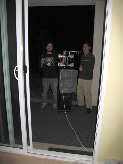 I wasn't even sure if we'd be able to pick up any channels with my super awesome BBQ-grill-lookin' indoor UHF antenna at their house because they kinda live in the bottom of a canyon. Turned out we had to put it out in the patio to get any reception, but we did manage to pick up a couple of high defintion channels with it. You can see the awesome antenna positioning device that Jeff and I built in this picture taken by Cami.