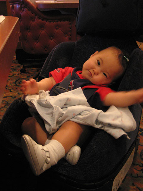 But I had to make sure we hooked up sometime while she was in town because I just had to meet her cute little daughter whom she brought with her... previously I'd only seen the pictures of Cheyenne I put up on Jeanette's site for her. So we ended up meeting for lunch at a Korean restaurant while she was on her way out of town to her next stop. When they rolled up, Cheyenne was fast asleep. I don't know, I just can't think of any more peaceful sight than a sleeping baby. Then again, maybe it only seems peaceful in contrast to the hell I know the little tykes are capable of raising, haha. All I know is that I got the same feeling I got when my old friend Zac's daughter was born -- "I gotta get me one of these!".