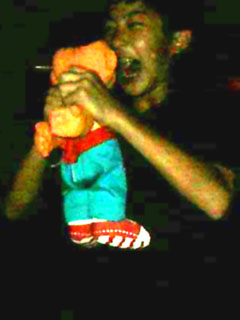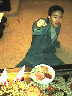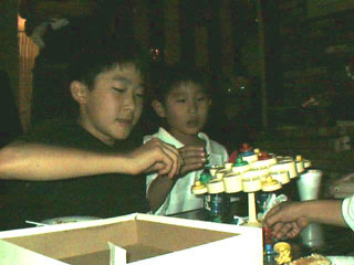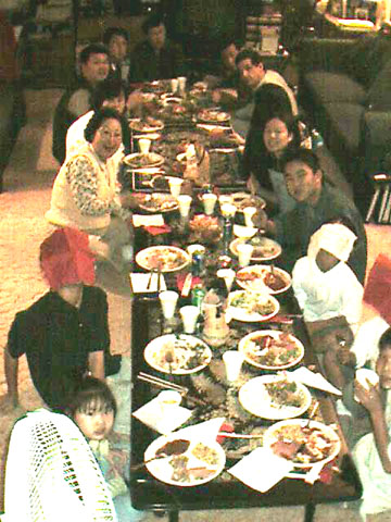 Here is almost everybody sitting around the table. Clockwise from the bottom left is: Kristy, Jason, my grandmother, my mom, Steve, Richard (the 4 boys' dad), my dad, Mr. Cho (Michael's dad), Tim, somebody who is not looking at the camera, Leslie my sister, Micheal, either Jonathan or Jordan, the other twin, and Justin. This pic is missing some people, like Loraine and her newborn baby, Gin and Michelle, and Christina.