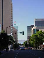 But man, was the drive great. Driving down by La Jolla Shores we had the warmth of the sun combined with the cool ocean breeze going on. Yeah. We also hit downtown and didn't stop anywhere there or anything. Except to take this picture. while standing in the middle of the street. And believe me, way in the back is the ocean. With sail boats sailing by. You can see them on the big version which isn't here. I entertained the thought of going into Fry's, but when I saw how packed the parking lot was from the freeway... and what the cars looked like on the offramp, I decided against that. Anyway. Man. I can't go on enough about how awesome the weather was today. For all of you people still stuck in the snow... I don't know what to say to you, except that San Diego has some pretty kickass weather. Even in early February.