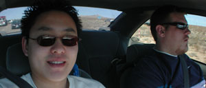 know I usually start new update pages on Sunday, I am currently in Scott's car on the way back from Vegas, and we are stuck in some traffic in the middle of the desert, so I decided to just take a few pics and write this little thing while I was sitting in the car. We tried to stop in Stateline to ride the Desperado roller coaster, but it was closed, so we ended up riding the lame log ride instead. For a log ride, it's pretty lame, but it does have the twist of also being a floating shooting gallery. You get these wireless guns to shoot at targets and keep score. Some of the targets are just little lights to shoot at, but others are mechanical people who you shoot at... and some of them shoot water back at you! That was sort of a surprise.