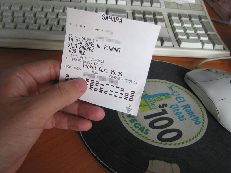 During my quick trip to Vegas in February, I went to the Sahara casino sports book and placed a $5 bet on the San Diego Padres winning the National League Pennant this year. It's got a date stamp on it that shows I placed the bet on February 20, 2005... well before the season even started! So now when the Padres start kicking some major ass and I sport some Padres gear and someone accuses me being a bandwagoner, I can say, "Look! I bet before the season started that the Padres would win the pennant!" and have actual proof of it too! Of course, I had to keep it kind of realistic. I mean, there's no way the Padres are gonna beat the Yankees in the World Series. So take that! Haters!